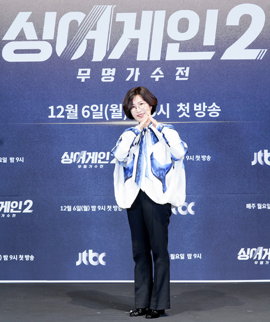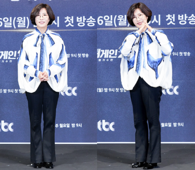 이선희는 독특한 블루와 화이트 컬러로 이루어진 블라우스를 착용한 모습을 선보였습니다. 하의는 부츠컷 블랙 팬츠로 깔끔한 라인을 만들어 세련된 분위기를 자아냈고, 블랙 구두로 전체적인 룩을 깔끔하게 마무리했습니다.