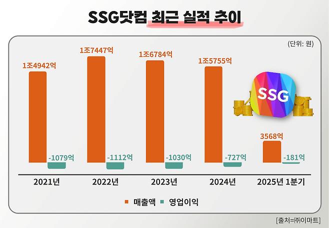 실제 SSG닷컴은 수년간 적자를 면치 못하고 있다. 이마트에 따르면 SSG닷컴의 영업적자는 ▲2021년 1079억원 ▲2022년 1111억원 ▲2023년 1030억원 ▲2024년 727억원에 이어, 2025년 1분기에도 181억원의 적자를 기록했다. 올해 1분기까지 누적된 적자 규모만 4128억원에 달한다.