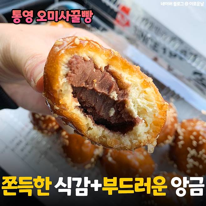 겉피의 쫀득한 식감과 앙금의 부드러운 맛을 동시에 즐길 수 있는 대한민국 원조 오미사꿀빵. 1963년부터 TV나 언론매체 등을 통해 전국에 알려지면서 통영의 명물이 되었다고 해요!