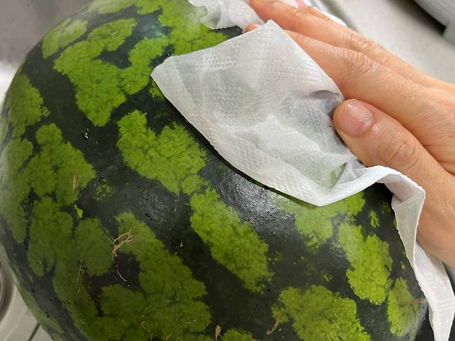 수박은 자르기 전 키친타월이나 행주로 껍질의 물기를 모두 제거해 줍니다.