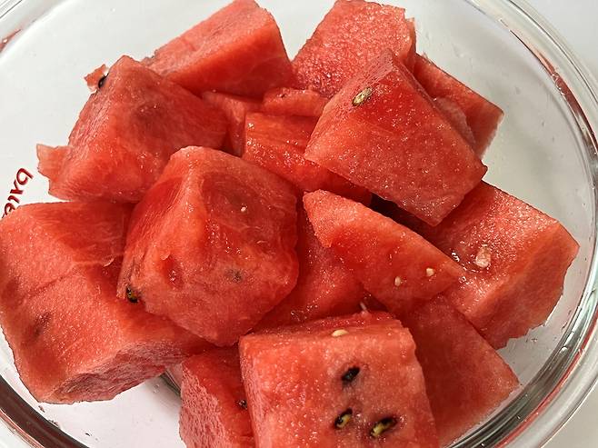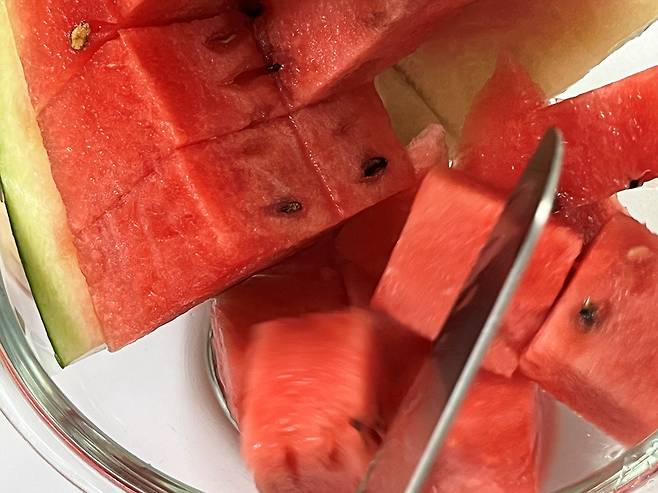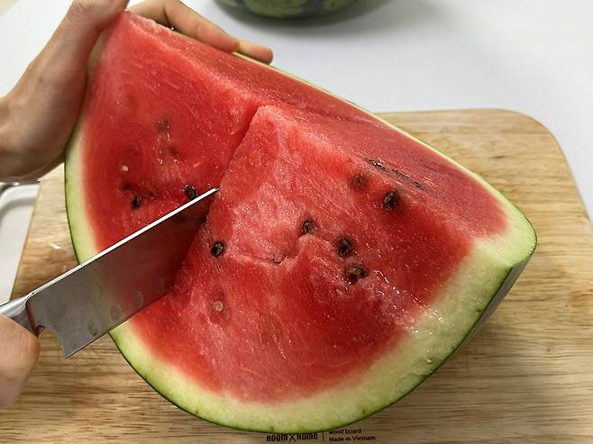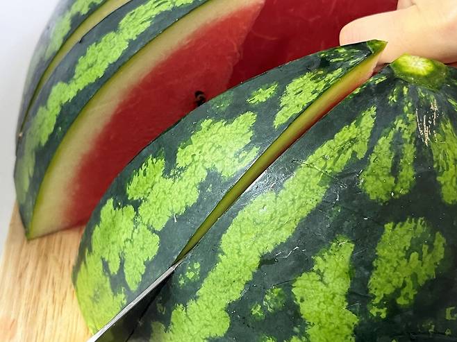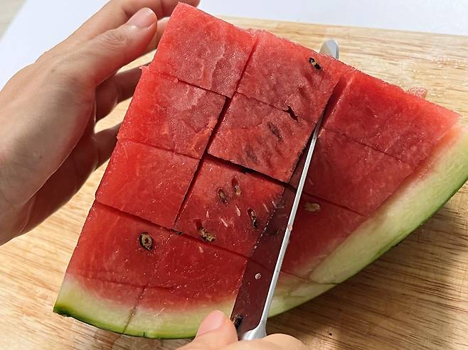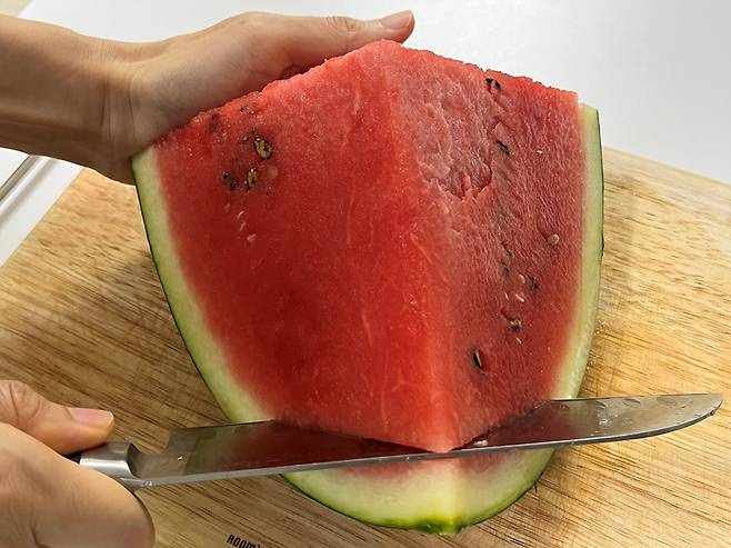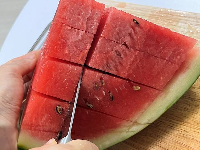 수박은 이렇게 조각내서 잘라 보관하면 자리 차지도 훨씬 덜하고 먹기에도 간편합니다. 수박 껍질 위에서 손질하면 돼서 설거지 거리도 별로 없습니다.