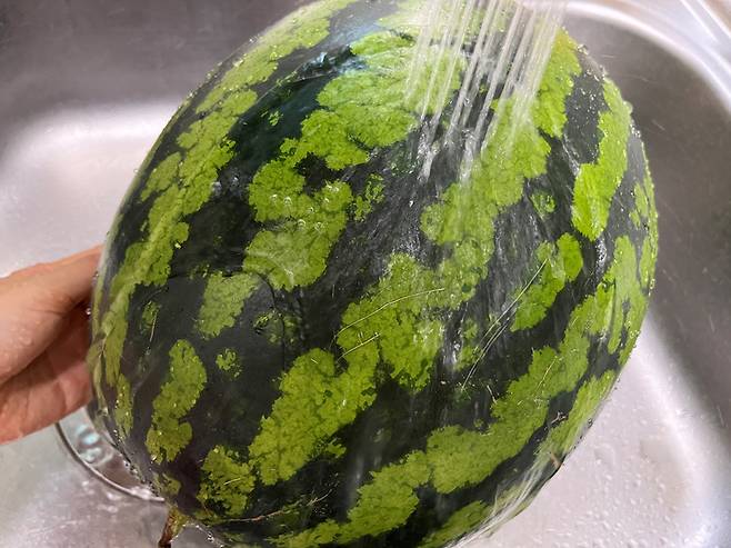 사 온 수박은 손질하기 전 겉면을 세척해 줍니다. 수박 껍질에는 잔류 농약 및 유통 과정에서 각종 오염 물질이 묻어 있을 수 있습니다. 가급적 손질 전 식초나 베이킹소다로 세척해 주세요.