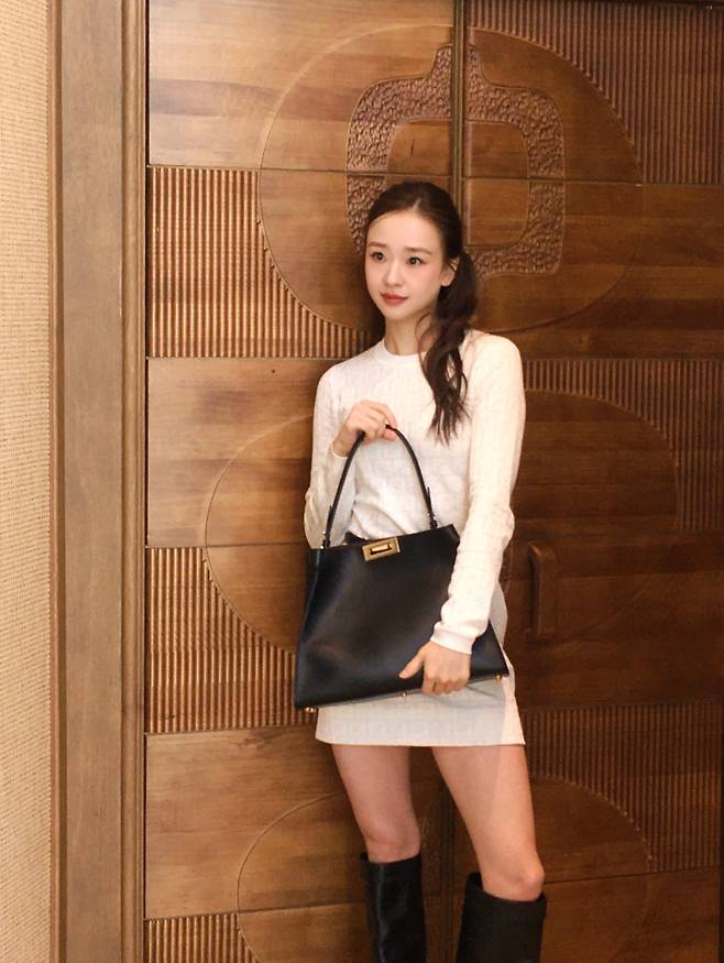 특히 무릎 아래까지 올라오는 검은색 긴 장화를 매치한 선택은 원피스의 짧은 길이감과 균형을 맞추며, 도시적이면서도 활동적인 세련미를 동시에 완성하는 영리한 포인트가 됩니다.