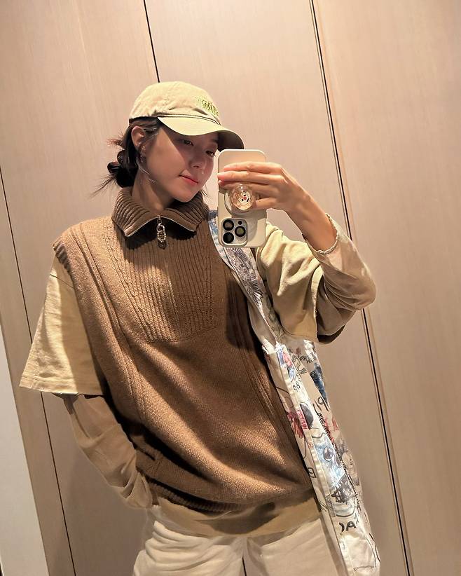 또 다른 컷에선 톤온톤 브라운 레이어링과 스냅백, 그리고 프린팅 숄더백으로 완성한 캐주얼한 거울 셀피까지.