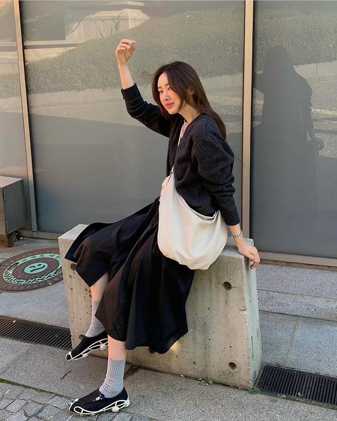특히 베이지색의 빅 사이즈 크로스백을 들어 실용성과 스타일을 동시에 챙겼으며 가볍게 어깨에 걸친 백이 룩에 자연스러운 무드를 더했습니다.