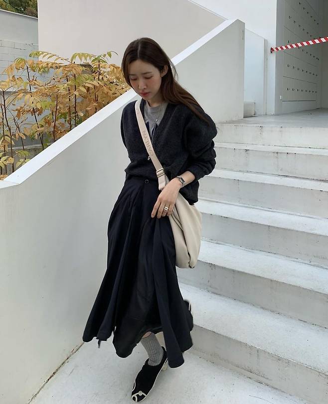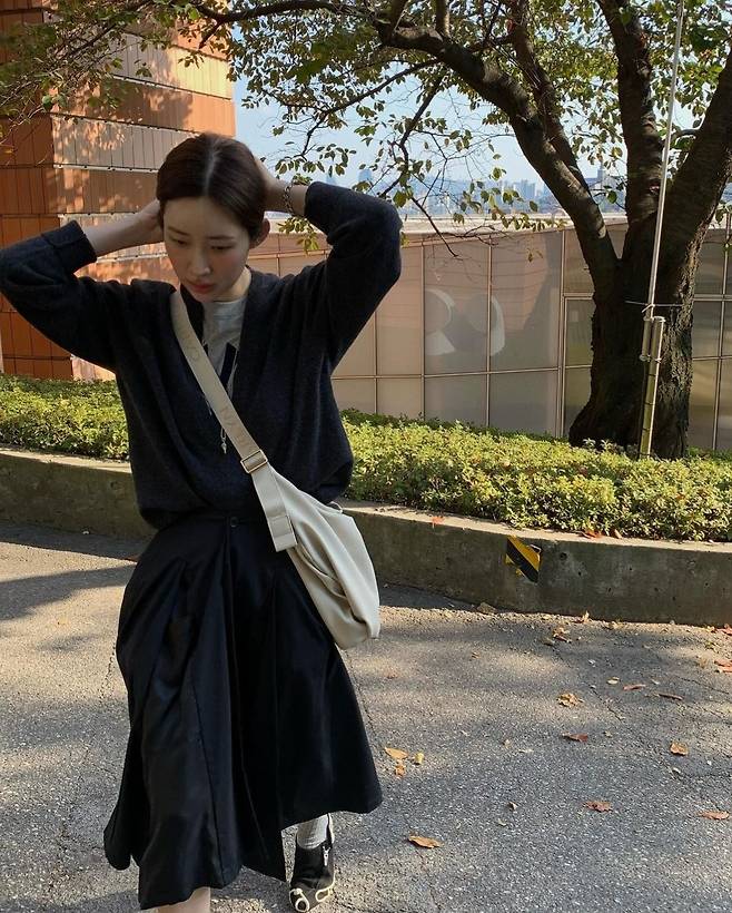 차정원은 짙은 네이비 컬러의 플리츠스커트와 여유 있는 핏의 카디건을 매치해 편안하면서도 멋스러운 분위기를 연출했습니다.