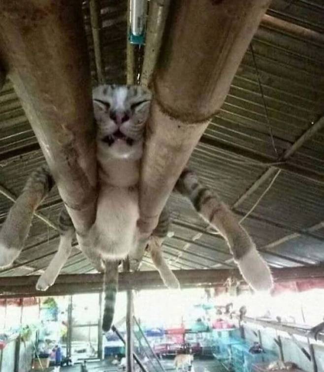 편안한 곳 놔두고 굳이 굳이 위험하지만 불편해 보이는 자세로 잠든 고양이가 있는데요. 왜 저렇게 자는지 정말 이해하고 싶습니다.