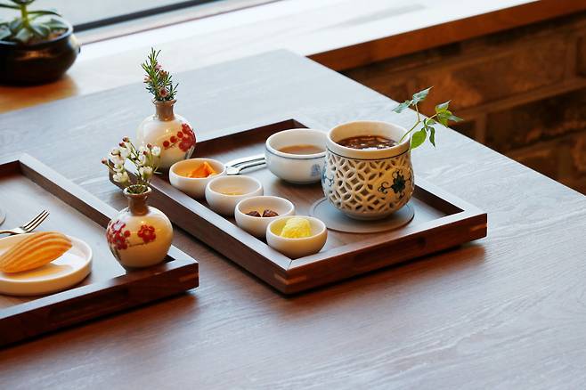 다겸에서는 대추차, 쌍화차, 십전대보차 등 다양한 전통차를 제공하며, 방문 시 기본적으로 웰컴 티와 다과류 및 구운떡 무료로 제공하는데요. 한방차의 문턱을 낮추기 위해서라고 합니다.