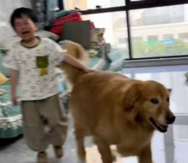 네, 그렇습니다. 서럽게 울고 또 우는 아들이 걱정된 골든 리트리버 강아지가 어떻게 해서든 달래주려고 한 것이었죠.