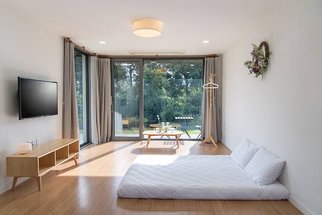 제주잔잔의 모든 객실은 전부 개별 욕실과 테라스를 가지고 있어요. 특히 통창을 통해 마주하는 초록빛 풍경이 무척 아름답습니다. 테이블도 마련되어 있어서 한가롭게 정원을 바라보며 시간을 보내기 좋아요. 정원에서 자주 마주칠 수 있는 고양이들도 이 숙소의 아름다운 분위기를 더욱 돋보이게 해 줍니다.
