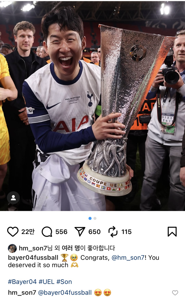 이에 손흥민 또한 해당 게시물 댓글에 하트 이모티콘을 붙이며 감사의 인사를 남겼다. 레버쿠젠을 떠난 지 10년이 됐지만, 레버쿠젠도 손흥민도 여전히 서로를 기억하며 응원하고 있었다.