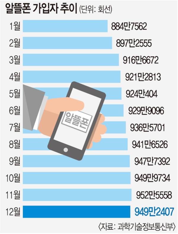 18일 과학기술정보통신부가 발표한 무선 통신서비스 통계에 따르면 지난해 말 기준 알뜰폰 가입 회선은 949만2407개로 집계됐다. 이는 직전달(11월·952만5558개) 대비 3만3151개 감소한 수치다.