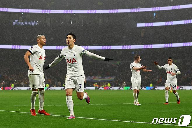 (로이터=뉴스1) 김도우 기자 = 토트넘 홋스퍼 손흥민이 31일(한국시간) 영국 런던의 토트넘 홋스퍼 스타디움에서 열린 본머스와의 2022-23 잉글랜드 프리미어리그(EPL) 20라운드에서 득점 후 기뻐하고 있다. 2024.1.1