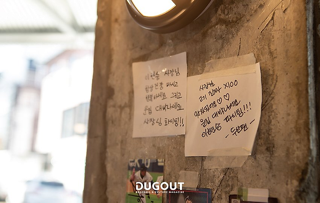 아니요. 매장을 보시면 아시겠지만 가게 안에 야구 관련해서 인테리어를 한 게 없어요. 저는 아예 야구는 배제하려고 했거든요. TV도 없고요. 저는 장사를 하려고 한 거지 야구선수로서의 절 알리려던 건 아니었어요. 만약 그랬다면 신천동으로 갔겠죠. 대신 팬분들이 오셔서 포토카드나 편지 같은 걸 주고 가셔서 붙여두긴 했죠. 원래는 제 사진만 붙이려고 했는데 저 잡스러운 카드들도… (장난) 농담이고 두산 친구들 것도 붙여주시더라고요.