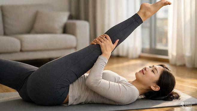 매트에 누운 상태에서 한쪽 다리를 들어 올리고 양손으로 잡아 몸 쪽으로 당긴다. 허벅지 뒤쪽 근육을 늘려 하체의 긴장을 완화한다.