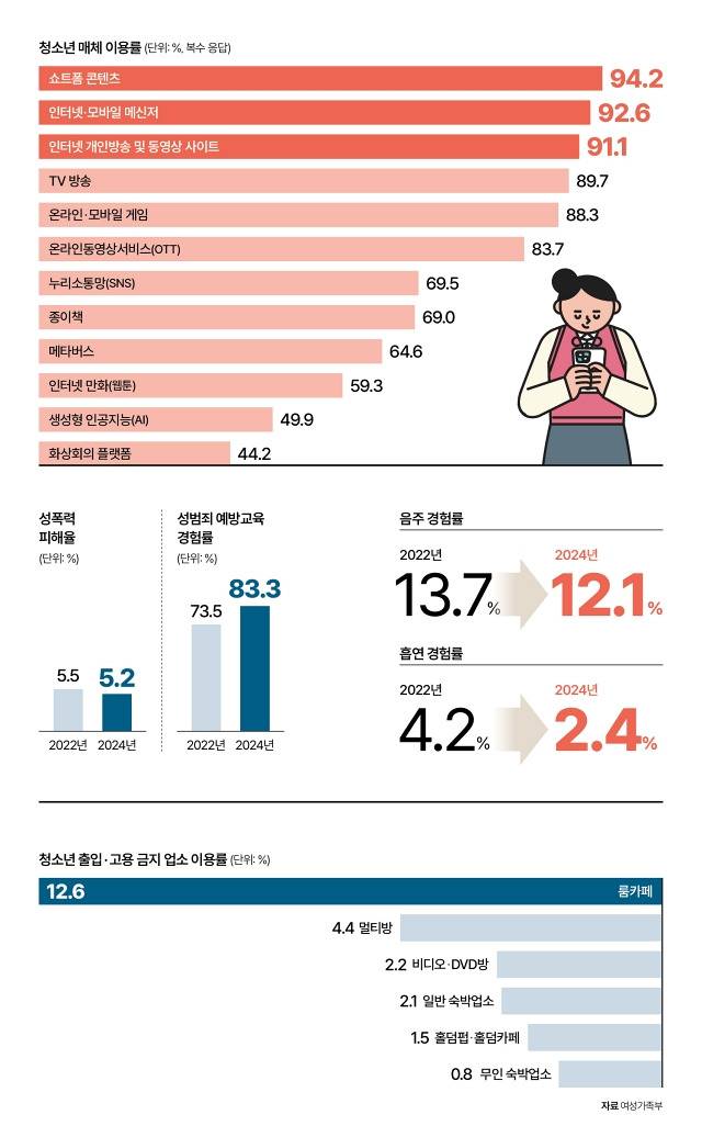 최근 1년간 청소년의 이용률이 가장 높은 매체는 ‘쇼트폼(짧은 영상)’ 콘텐츠인 것으로 조사됐습니다. 또한 청소년의 절반가량은 생성형 인공지능(AI)을 사용해본 것으로 드러났습니다. 청소년의 성인용 영상물 이용률과 음주·흡연 경험은 모두 감소했습니다. 여성가족부는 4월 1일 이 같은 내용의 ‘2024년 청소년 매체이용 및 유해환경 실태조사’ 결과를 발표했습니다. 여가부는 청소년 보호법에 따라 청소년 보호정책 수립에 필요한 기초자료로 활용하기 위해 2년마다 실태 파악 조사를 하고 있습니다. 이번 조사는 지난해 전국 17개 시·도 초(4~6학년), 중·고등학교에 재학 중인 청소년 1만 5053명을 대상으로 했습니다. 자세한 내용은 정책주간지 'K-공감'을 확인하세요.
