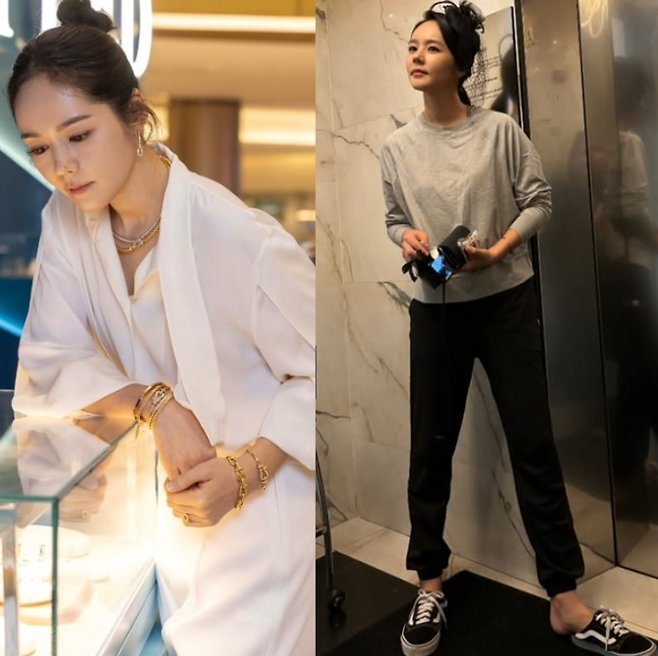 아우터는 캐주얼한 블랙 재킷을 선택했어요. 두루 활용할 수 있는 디자인이었는데요. 한가인 님은 가볍게 걸쳐주면서도 자연스럽게 핏을 살려 멋스럽게 연출했어요.