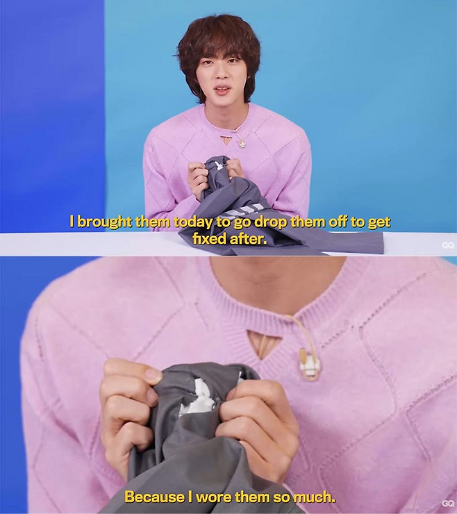 2022년 진은 입대 전 QG와의 인터뷰에서 자신의 아이템을 공개하는 시간을 가진 바 있다. 가장 이목을 끈 건 바로 유명 명품 브랜드인 톰 브라운의 회색 바지였는데, 너무 자주 입어서 옷에 구멍이 나 수선을 맡기기 위해 가지고 나왔다고 밝힌 바 있다.