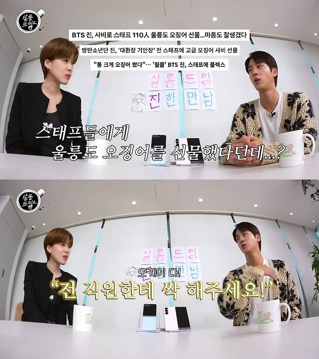 부모님과 가족들에게만 잘하는 효자일 뿐만 아니라 마음 씀씀이도 보통이 아닌 진. 최근에는 울릉도에서 한 촬영을 마친 후 110명이 달하는 스태프 전원에게 울릉도 오징어를 선물하기도 했다.