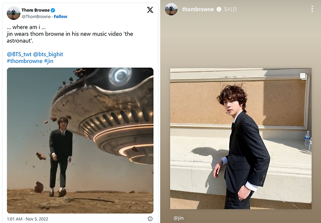 이에 톰브라운 공식 계정 역시 진에 대한 애정을 드러낸 바 있는데, 올 상반기에는 진이 제대하고 나면 톰 브라운의 글로벌 앰버서더가 될 것이라는 루머가 있기도 했다. 아직까지는 양측에서 공식전일 발표를 따로 하지는 않았지만, 이쯤이면 실현 가능성이 무척 농후하지 않나 싶다.