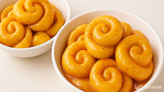 완성된 반죽은 동그랗게 빚어 입구 좁은 병뚜껑에 눌러 찍는다. 병 입구로 낸 모양이 익으면 더 예쁘게 잡힌다. 끓는 물에 넣고 떠오르면 얼음물에 헹군다. 겉은 쫀쫀하고 속은 탱탱한 식감이 완성된다.