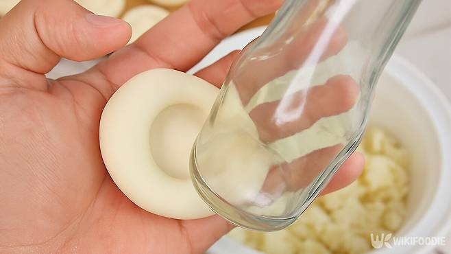 4. 반죽을 동그랗게 빚고 병 입구로 눌러 모양을 낸다.