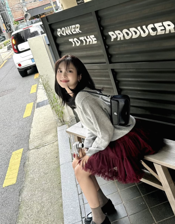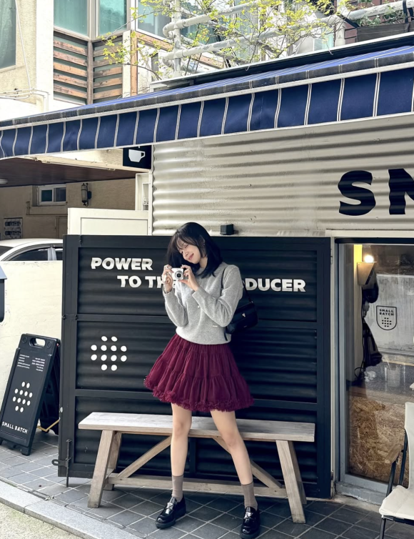 그녀가 착용한 아이템은 국내 패션 브랜드 SINOON에서 발매된 "Tute Skirt (Wine)"로, 사랑스러운 실루엣과 풍성한 튤 소재가 돋보인다.