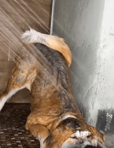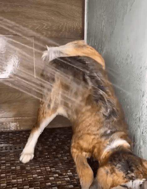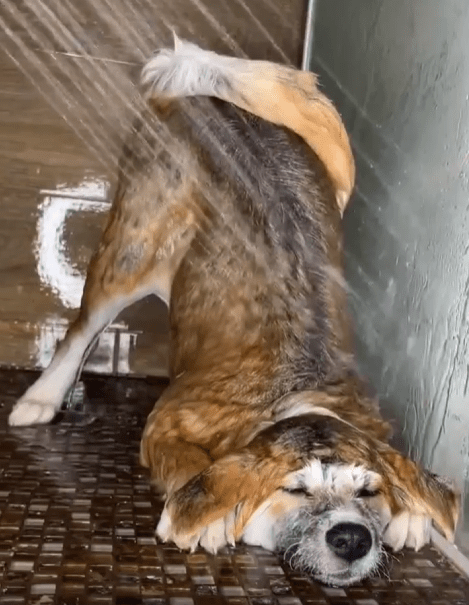 강아지 옆에선 주인이 샤워기를 들고 조심스레 물을 뿌려주고 있습니다. 세게 틀지도 않고, 너무 가까이 대지도 않은 채, 부드럽게 엉덩이 근처부터 허리, 등선을 따라 물줄기를 움직입니다. 강아지는 움직이지 않습니다. 아니, 정확히 말하면 ‘움직이지 않기로 결정한 듯한’ 태도로, 이 모든 과정을 묵묵히 받아들이고 있죠. 엉덩이를 든 자세는 불편해 보일 법도 한데, 강아지의 눈빛은 오히려 나른하고 평온합니다.