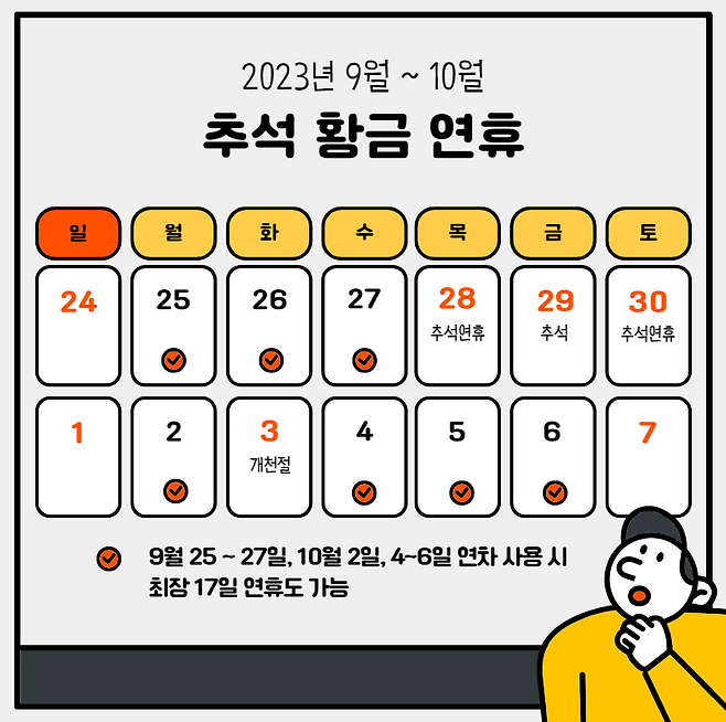 역대급 더위가 찾아왔던 여름 휴가철이 끝물을 보이는 가운데 '제 2의 성수기'가 다가오며 직장인들의 이목이 쏠리고 있습니다. 바로 휴가를 잘 활용하면 10일 이상 긴 휴가를 즐길 수 있는 추석 황금 연휴인데요.