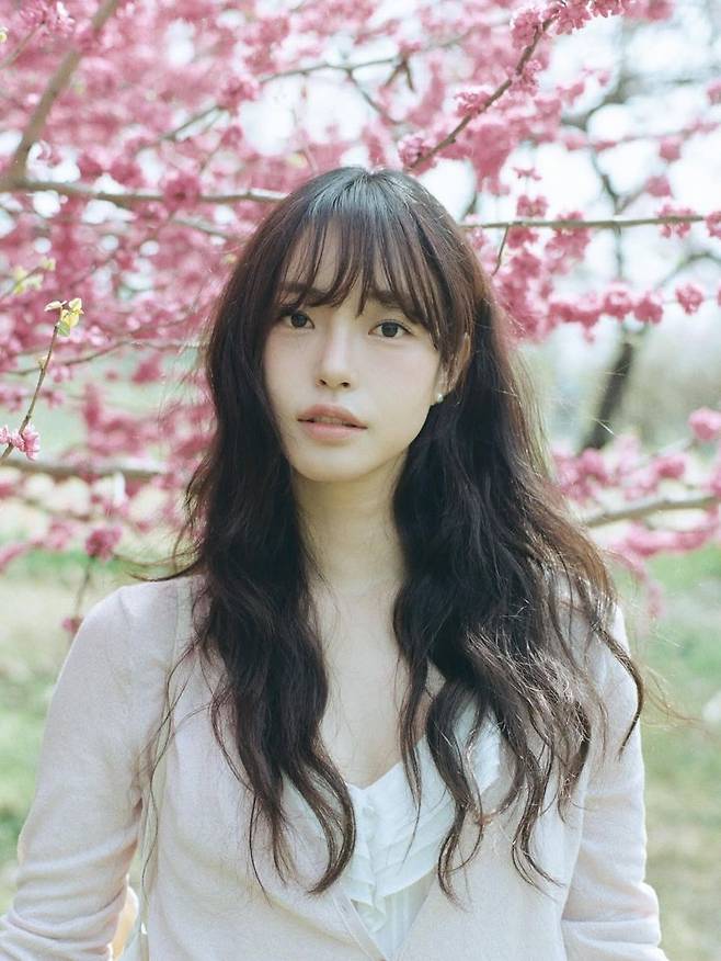 첫 번째 사진에서는 핑크빛 벚꽃을 배경으로 은은한 베이비핑크 가디건과 화이트 드레스를 매치한 모습이 눈길을 끈다. 가디건은 몸에 살짝 핏되는 실루엣으로 여성미를 살렸고, 그 아래 흐르는 듯한 원피스는 가녀린 분위기를 강조한다. 여기에 내추럴한 웨이브 헤어와 무심한 듯 자연스러운 표정이 어우러져 황세온 특유의 맑고 몽환적인 매력이 돋보인다.