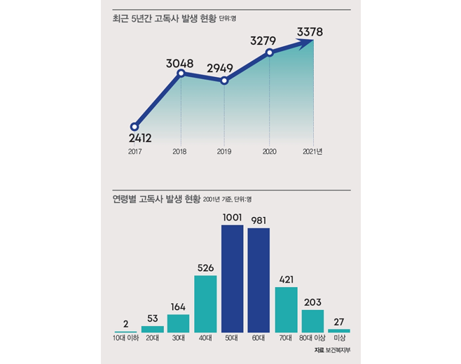 독거노인이 고독사한 채 발견됐다는 뉴스를 자주 접합니다. 가정의 달인 5월에도 어김없이 이런 뉴스는 이어지고 있습니다. 보건복지부가 2022년 12월 14일 발표한 ‘2022년 고독사 실태조사’ 결과에 따르면 2021년 고독사한 사망자는 3378명에 달합니다. 2021년 국내 전체 사망자는 31만 7680명으로 100명 가운데 1명이 고독사로 숨진 셈입니다. 문제는 고령화와 1인가구 증가 등으로 고독사가 매년 늘고 있다는 것입니다. 2017년부터 2021년까지 불과 5년 사이 40%나 급증했습니다.
