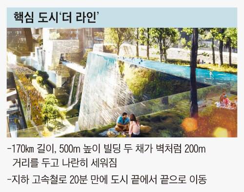 빈 살만의 의지가 투영된 도시가 네옴의 핵심 주거단지 ‘더 라인’이다. 네옴 프로젝트 실무는 주로 미국 대형 건설사(벡텔)와 인프라 컨설팅사(에이콤)가 주도하고 있는데, 기본 도시 계획은 미 건축회사 모포시스가 맡고 있다. 모포시스가 최근 공개한 더 라인은 그동안 지구상에 존재하지 않았던 도시 모습을 하고 있다. 길이 170㎞ 직선 형태의 거대한 벽처럼 생긴 빌딩 2개 사이에 모든 인프라를 집약한 형태다. 두 쌍둥이 빌딩의 높이는 500m로 102층인 엠파이어스테이트 빌딩(381m)보다 높다. 빌딩 외벽에는 거대한 거울이 달려 주변 사막을 비추면서 도시가 자연 속에 숨어 있는 듯한 모습을 연출한다. 네옴 측은 “서울 면적의 6% 공간에 서울과 같은 900만 인구를 수용할 수 있으며, 95%의 자연환경을 보전할 것”이라고 설명했다.