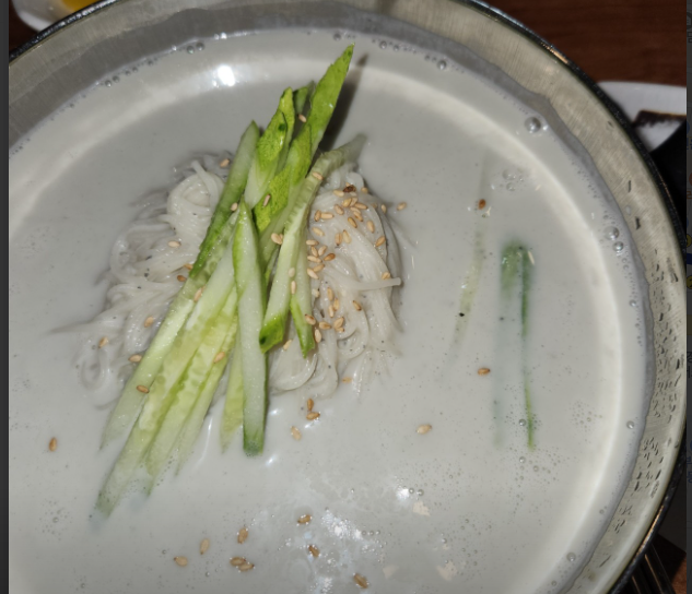 바로 콩국수! 적당히 걸쭉하고 고소한 국물에 오이와 깨소금까지 올라가 첫 입부터 마지막까지 든든하고 시원합니다.