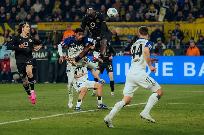 이어 펠릭스 은메차는 전반 22분 함부르크의 역습 상황에서 결정적인 수비를 펼치며 추가 실점 위기를 막아냈다. 전반 24분에는 그레고어 코벨이 쾨니히스되르퍼의 슈팅을 막아냈고, 이어진 코너킥 상황에서 다시 한 번 공이 골문 안으로 들어갔지만 쾨니히스되르퍼의 오프사이드가 선언되면서 도르트문트는 한숨을 돌렸다. 그러나 전반 38분 도르트문트가 후방 빌드업 과정에서 두 차례 공을 빼앗긴 끝에 알베르트 로콩가가 추가골을 터뜨리며 함부르크가 2-0으로 달아났다. 불과 몇 초 전 니코 슐로터베크의 헤더가 크로스바를 맞고 나온 상황이었기에, 1-1 대신 0-2가 되며 아쉬움을 더했다. 은메차는 전반 45분 오마리가 바이어를 넘어뜨리며 얻어낸 페널티킥의 키커로 나섰지만, 슈팅이 왼쪽 골포스트를 벗어나며 만회골 기회를 살리지 못했다.