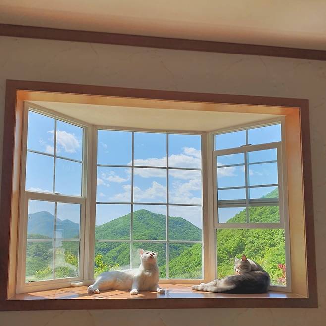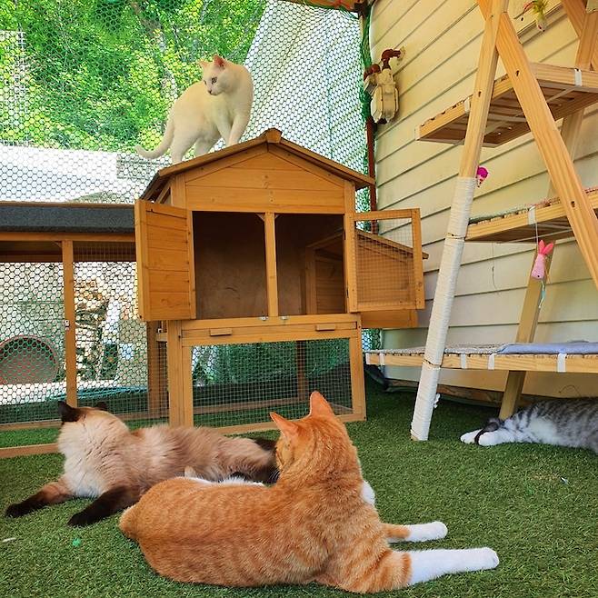 캣타워와 캣폴을 넉넉히 설치해 주고, 캣그라스와 캣닢도 두었어요. 바로 뒤가 숲이라서 새들이 많이 오는 편인데, 그럴 때마다 고양이들이 신나서 구경한답니다. 질리지도 않는지 하루도 빼먹지 않고 출석 도장을 찍어요. 낮잠도 꼬박꼬박 나가서 자고요.
