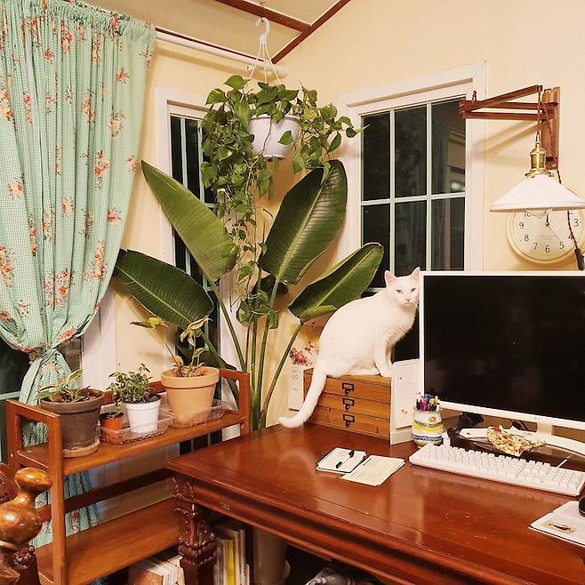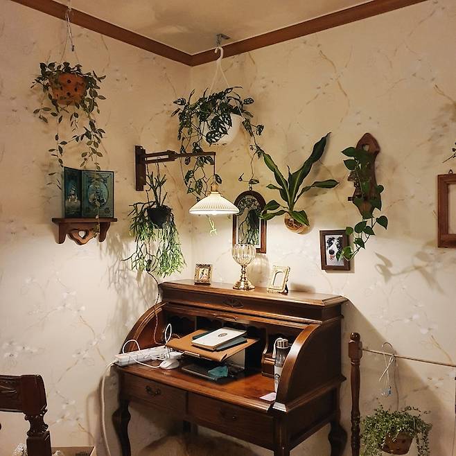 책상 위에는 언제나 식물을 주렁주렁 걸어둬요. 초록색을 보는 게 스트레스를 줄이는 데 도움이 되어서, 앞으로도 식물덕후 생활을 쭈욱 이어갈 것 같아요.