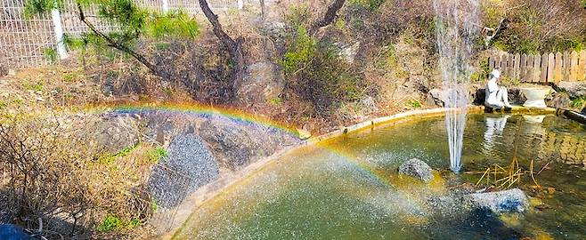 연못에는 연꽃도 피고, 개구리도 살아요. 분수를 틀면 예쁜 무지개도 볼 수 있답니다. 생각보다 연못이 커서, 겨울에는 이 위에서 얼음썰매를 타기도 해요.