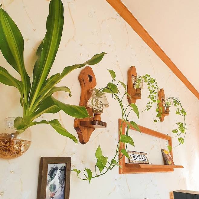벽에 걸어두니 고양이로부터 안전하고, 해가 잘 드는지 관엽식물들이 쑥쑥 자란답니다.