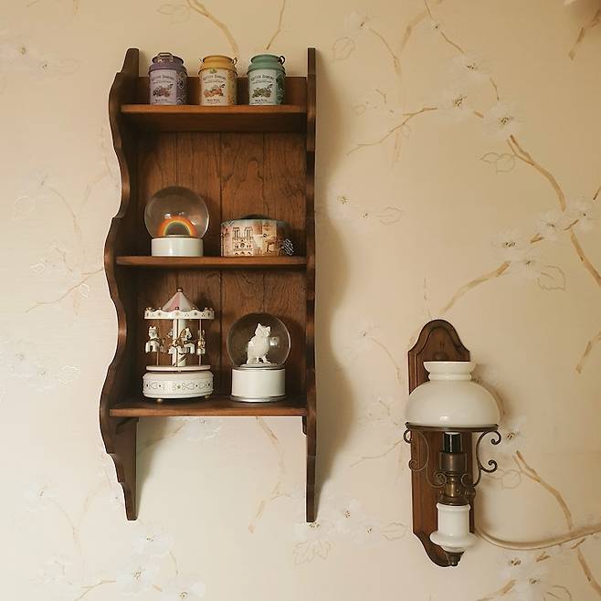 침대 옆에도 제가 좋아하는 소품이 있는데요. 프랑스 빈티지인 조명과 영국 빈티지인 선반이에요. 선반 위에는 제가 여행을 하며 하나씩 모은 스노우볼과 오르골을 두었어요. 각각 런던, 프라하, 파리, 뉴욕에서 온 소품들이랍니다. 코로나가 끝나면 더 추가될 예정이에요.