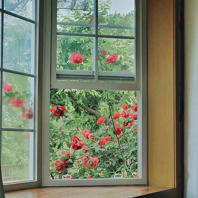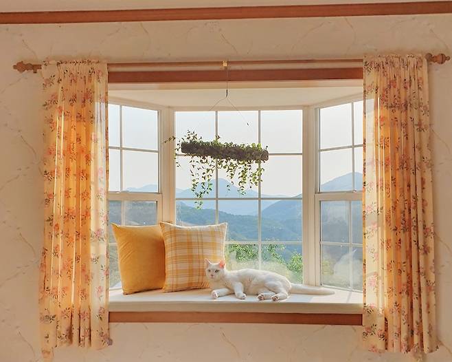 커튼을 열면 이렇게 예쁜 창문과 윈도우 시트가 등장해요. 여름이면 안방 창문을 타고 올라가는 장미를 볼 수 있어요.