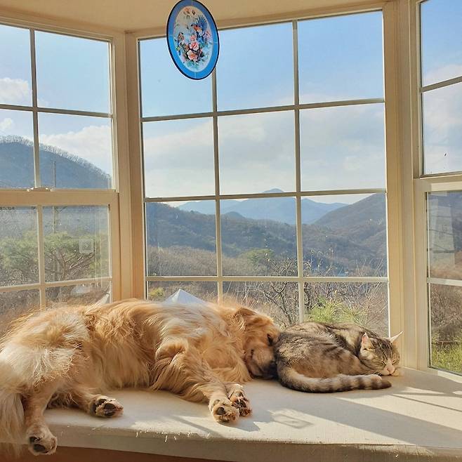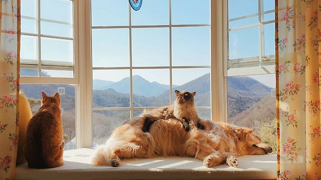 윈도우 시트는 365일 비어있는 날이 없는 인기석이에요. 심지어는 앞에 밟고 올라갈 계단을 놔주니 골든레트리버 다올이도 한번 올라가면 잘 내려오지 않는답니다. 고양이 제제는 다올이를 쿠션으로 쓰고 있네요...