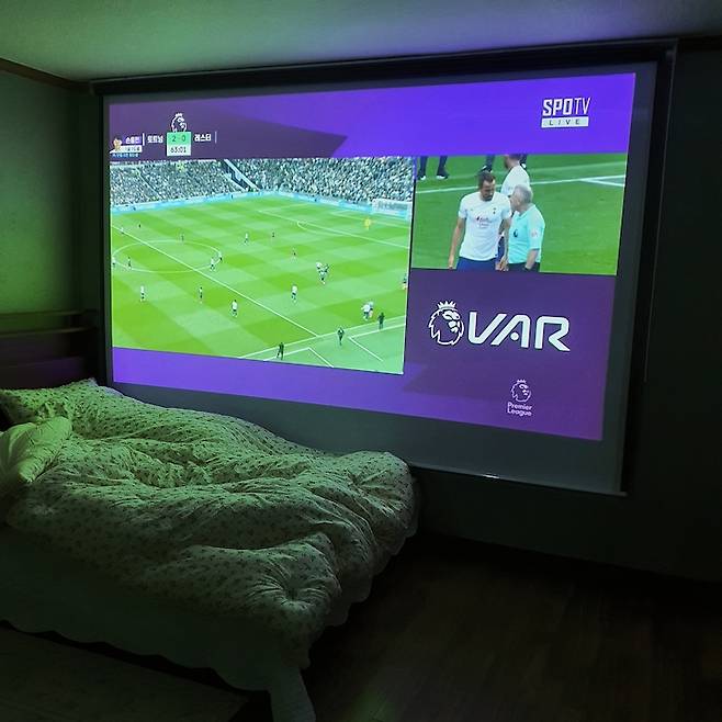 안방은 아빠의 아지트이기도 해요. 침대 위 벽에 스크린을 달고 매일 축구나 영화를 보신답니다. 침실 겸 홈시어터인 셈이죠!
