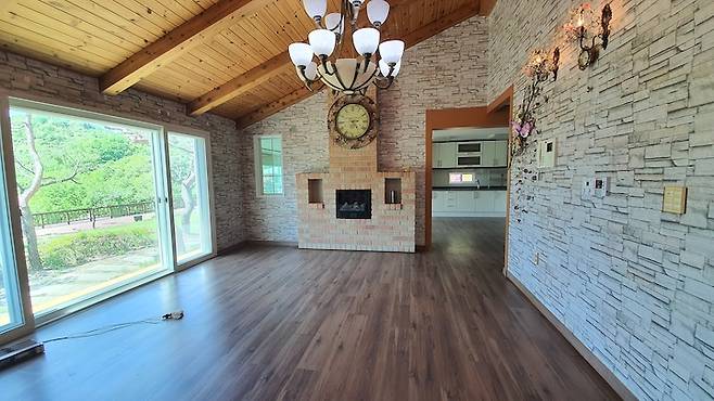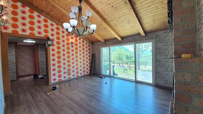 앞서 보여드렸던 가장 심각했던 1층 거실이에요. 빨간 꽃무늬 벽지와 온갖 꽃 장식... 어두침침한 조명까지 뭐 하나 살릴 수 있는 게 없었어요. 특히 처음 집을 지을 때부터 있었다는 저 벽돌 난로가 굉장히 애매해서 고민이었어요. 집 넓이에 비해 거실이 그리 크지 않은 것도 아쉬웠고요.