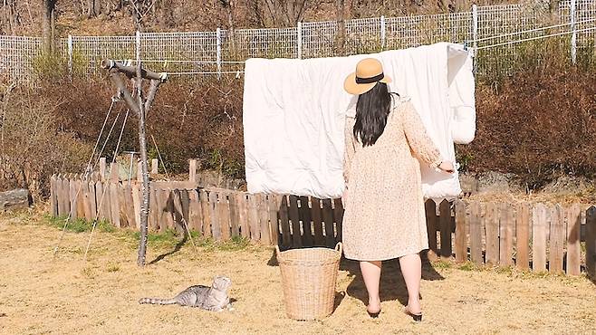 이불을 햇빛에 널어두는 저를 개냥이 라온이가 빤히 구경 중인 모습이랍니다. 이 집에 와서 느리고 행복하게 사는 법에 대해 많이 배웠어요. 낡은 주택은 손이 가는 곳이 한둘이 아니고, 모든 걸 직접 해야 하거든요. 사진 속 빨래 건조대와 울타리도 모두 아빠가 한 땀 한 땀 만드신 거예요.