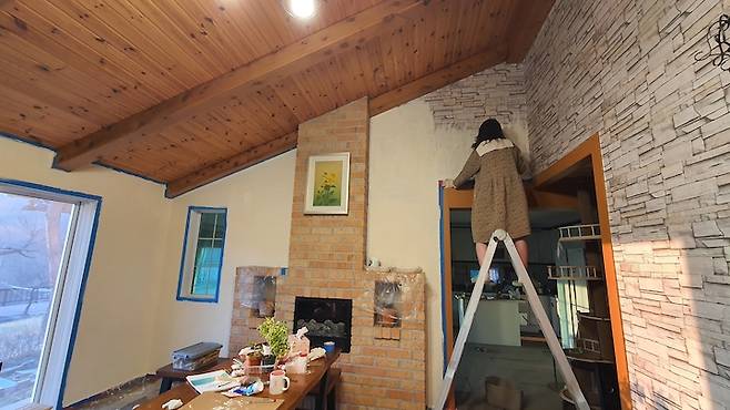 보기만 해도 시력이 떨어질 것처럼 어지러웠던 꽃무늬 거실... 무작정 페인트를 사서 엄마와 저, 둘이서 칠하기 시작했어요. 하루 종일 해도 모자라서, 이틀 넘게 매달렸답니다. 특히 층고가 높아서 사다리 위에 서서 작업해야 했어요.ㅎㅎ