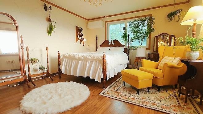 완벽하게 변신한 제 방의 현재는 이런 모습이에요. 화장대와 침대, 거울, 스탠드 모두 빈티지 제품이에요. 화분을 받치고 있는 스툴들도 몇 달을 기다려서 해외 빈티지 제품을 구한 거랍니다!