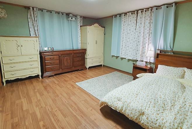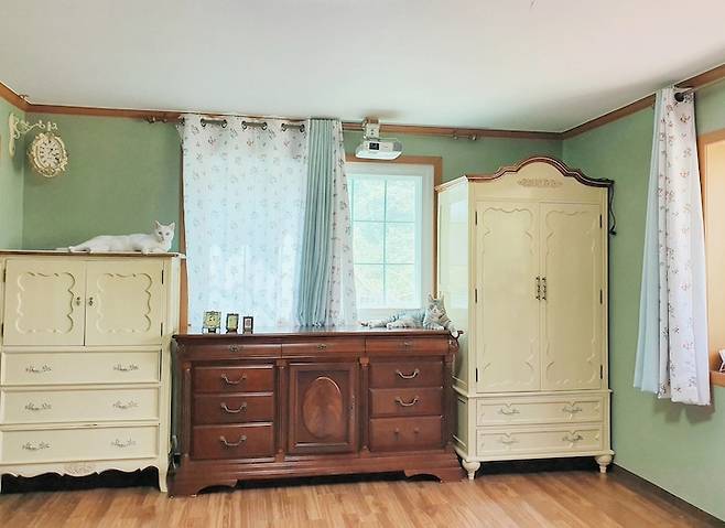 안방의 콘셉트는 빨간 머리 앤의 방 어른스러운 버전이었어요. 엄마가 빨간 머리 앤 팬이시거든요. 빈티지한 분위기를 내기 위해서 톤 다운된 올리브그린 페인트를 바르고, 버터 색 빈티지 옷장과 마호가니 서랍장도 구했어요!