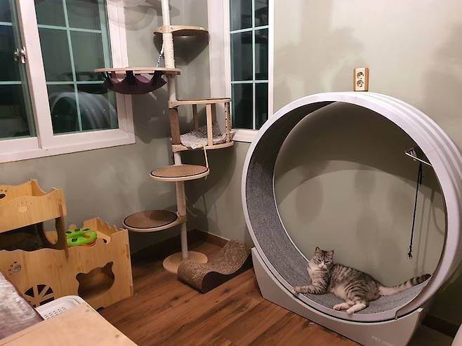 2층 거실은 온전히 고양이들의 공간이에요. 언제든 창밖을 볼 수 있는 캣 폴과 운동용 캣 휠, 고양이 아파트, 스크래쳐, 식사 공간이 모두 모인 곳이랍니다. 특히 창이 두 개나 있어서 고양이들이 정말 좋아해요.