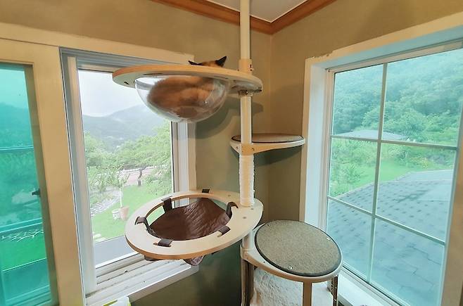 이렇게 캣 폴 위에 올라가면 양쪽 창문을 통해 마당을 전부 구경할 수 있어요. 특히 날아가는 새를 구경하기에 최적의 공간이랍니다. 그래서 고양이들이 여기에서 낮잠을 자주 자요.