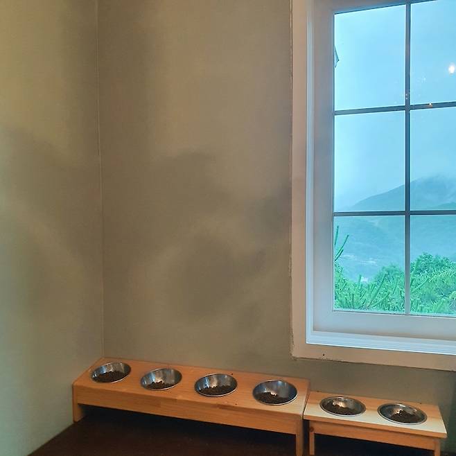 고양이와 강아지를 함께 키우기 때문에 테이블 위에 고양이 전용 식당을 마련했어요, 고양이 식탁을 바닥에 두면 강아지들이 다 뺏어 먹거든요ㅋㅋㅋ 덕분에 고양이 식당에서 바라보는 뷰가 엄청 좋아요.